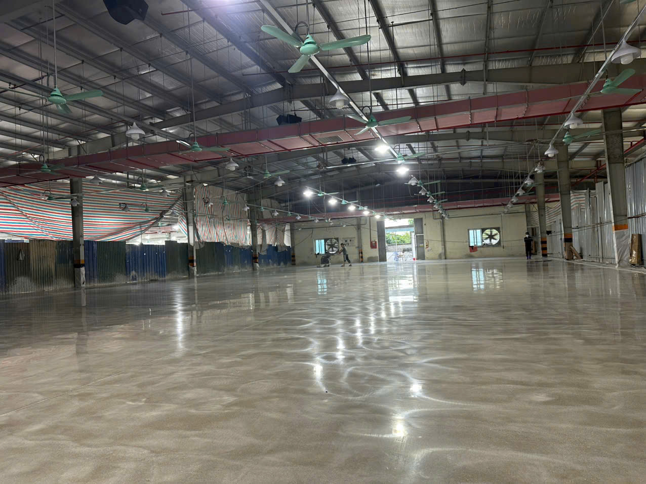 Trong lĩnh vực xây dựng nền công nghiệp hiện đại, sàn bê tông không chỉ cần độ bền và khả năng chịu tải mà còn phải đảm bảo tính thẩm mỹ và an toàn. Tại dự án Công ty TNHH Giầy Adiana Việt Nam – Thọ Xuân, Thanh Hóa, đội ngũ kỹ thuật đã triển khai giải pháp mài tăng cứng kết hợp đánh bóng sàn lộ cát, mang lại diện mạo mới và nâng cao chất lượng cho toàn bộ nhà xưởng.